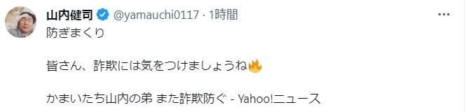 山内さんは、剛さんが詐欺を防いだニュースのリンクを添えつつ「防ぎまくり 皆さん、詐欺には気をつけましょうね」と、炎の絵文字と共に投稿しました。