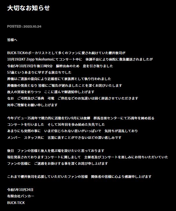 10月19日KT Zepp Yokohamaにてコンサート中に 体調不良により病院に救急搬送されましたが令和5年10月19日午後11時9分 脳幹出血のため 息を引き取りました