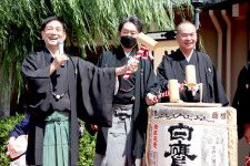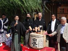 セレモニーには上方落語協会副会長の桂米團治(63)も参加。鏡開きの後、振る舞い酒が振る舞われた。
