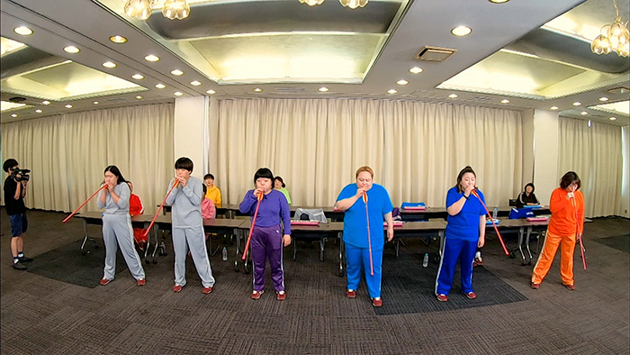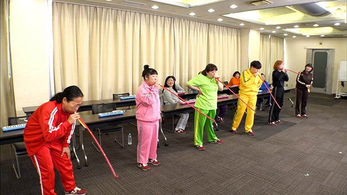 そして挑むのは、鍵盤ハーモニカ!妹尾美穂さんとソラノオトのみなさん指導の元、まずは基本を学ぶ。音が切れないように吹く吹き方を学ぶため、吹き戻しを使ってロングトーン対決!