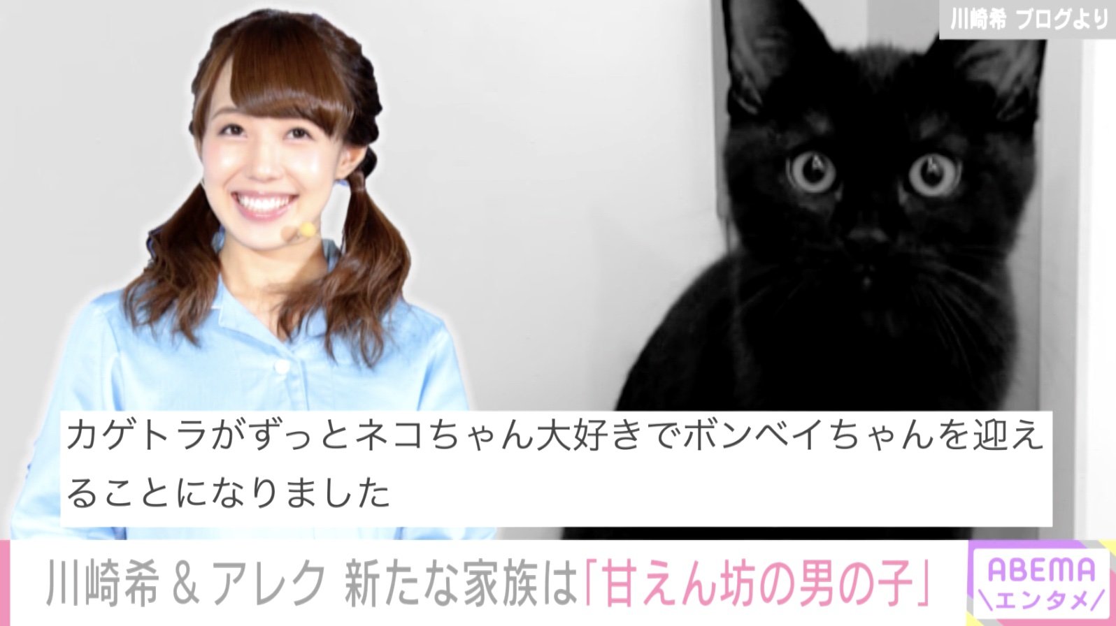 「ボンちゃん」というタイトルで更新したブログで川崎さんは「黒猫のボンベイ 実は3週間前くらいからおうちにいます とっても甘えん坊の男の子 カゲトラがずっとネコちゃん大好きでボンベイちゃんを迎えることになりました」と長男のカゲトラくんがきっかけでネコを飼い始めたことを明かした。