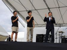 「Red Bull Box Cart Race Osaka 2022」でトークショーを行ったジャルジャルの福徳秀介、後藤淳平、後藤圭二吹田市長(左から) (サンケイスポーツ) 手作りカートのレース「Red Bull Box Cart Race Osaka 2022」が22日... -