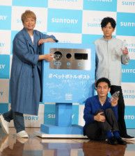 「〜みんなのボトルを、みらいへ!〜 生まれ変わって、次の人に届くペットボトルポスト記者発表会」で。左から、香取慎吾、稲垣吾郎、草なぎ剛 (日刊スポーツ) 稲垣吾郎、草なぎ剛、香取慎吾が20日、都内で行われた「〜みんなのボトルを、みらいへ!〜 ... -
